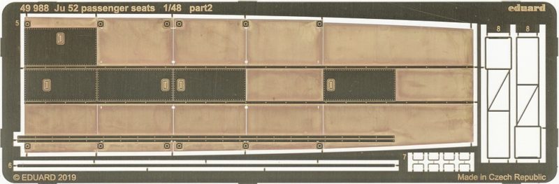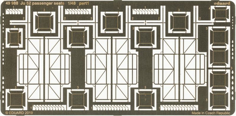Im vorliegenden Fall handelt es sich um neu zu erstellende Sitzreihen der Passagier- / Frachtkabine. Diese sind aus Messingblech geätzt und bestehen aus zwei unterschiedlich großen Bögen. Im Gegensatz zur Eduard-Bezeichnung handelt es sich nicht, wie man etwa annehmen könnte, um die Sitze der Passagierversion der Ju 52. Tatsächlich sind es die Rohrgestelle mit Sitzmulden wie sie bei Flugzeugen für Fallschirmeinheiten verwendung fanden. Sicherlich sind diese Rohre nun „flach“ umgesetzt, was aber im Maßstab 1/48 noch akzeptabel ist.