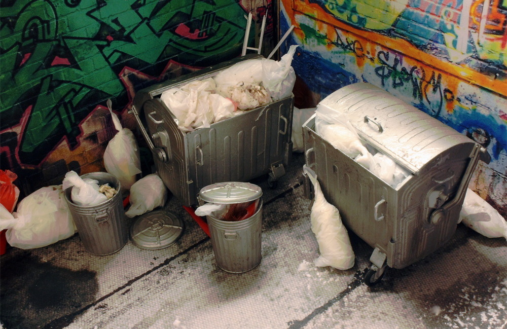 Das bedeutete zum einen, dass ich die Behältnisse mit unappetitlichem Inhalt überfüllen wollte. Ganz materialecht wurden daher Stücke von Plastikfolie um verschiedenen „Abfall“ herumgedreht, mit einem Tropfen Superkleber sozusagen zugebunden und diese dann in die Container gestopft, zum Schluss noch um diese herum drapiert.