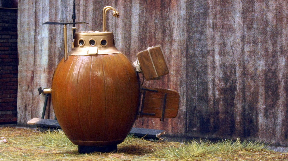 Die Baufotos legen Zeugnis davon ab: die Modellmaße der Turtle sind ohnehin schon klein, der Guss aus transparentem Kunststoff fällt noch dazu unsauber und schrundig aus, sodass ich nach den ersten Montageschritten ein wirklich unansehnliches „Plastik-Ei“ vor mir hatte. Klarheit, was da denn nun möglich wäre, brachte erst die farbige Grundierung des Ganzen. Nach einigem Schleifen und Nachgravieren begannen sich die Formen der Turtle abzuzeichnen. Die Bullaugen bohrte ich auf, um sie am Ende des Bauprozesses mit Klearfix zu verfüllen.