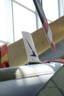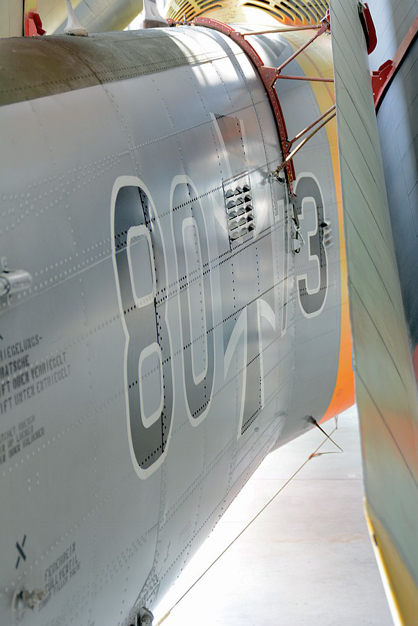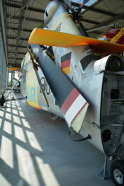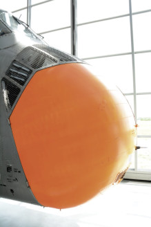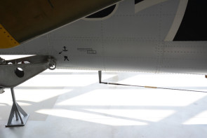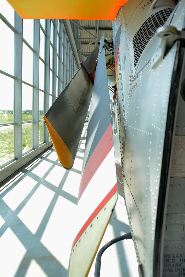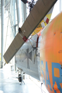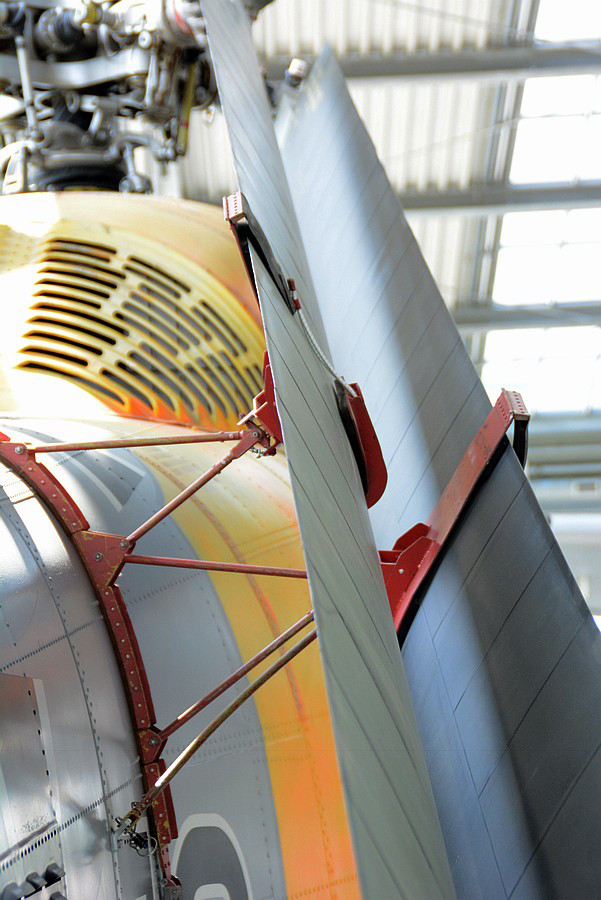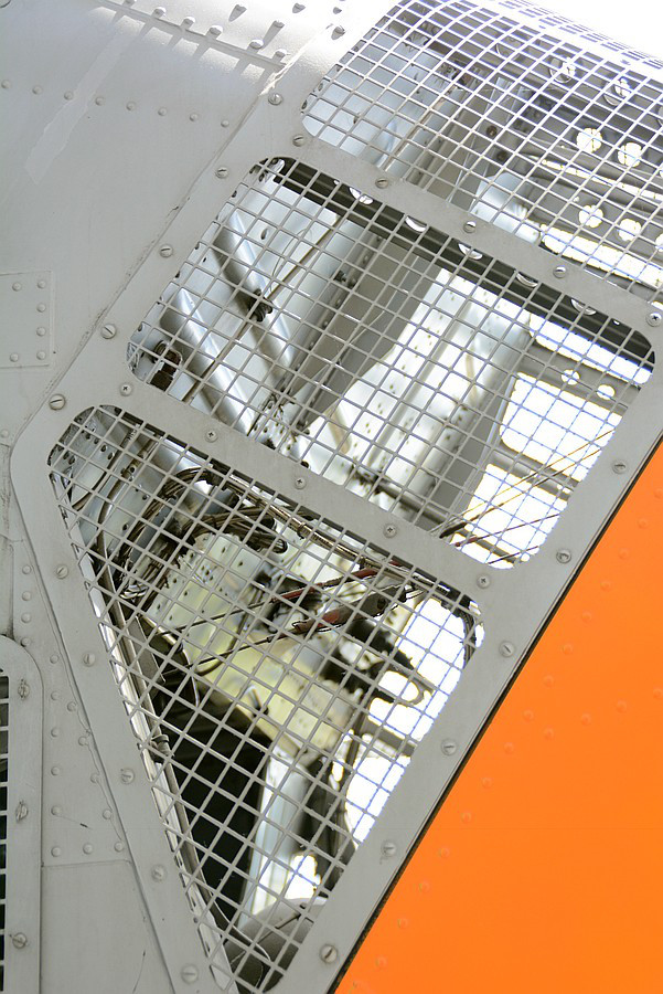 durch ein Brandschott abgetrennt – der luft-/gebläsegekühlte Neunzylinder-Sternmotor unter einer kuppelförmigen Verkleidung montiert, die sich nach links